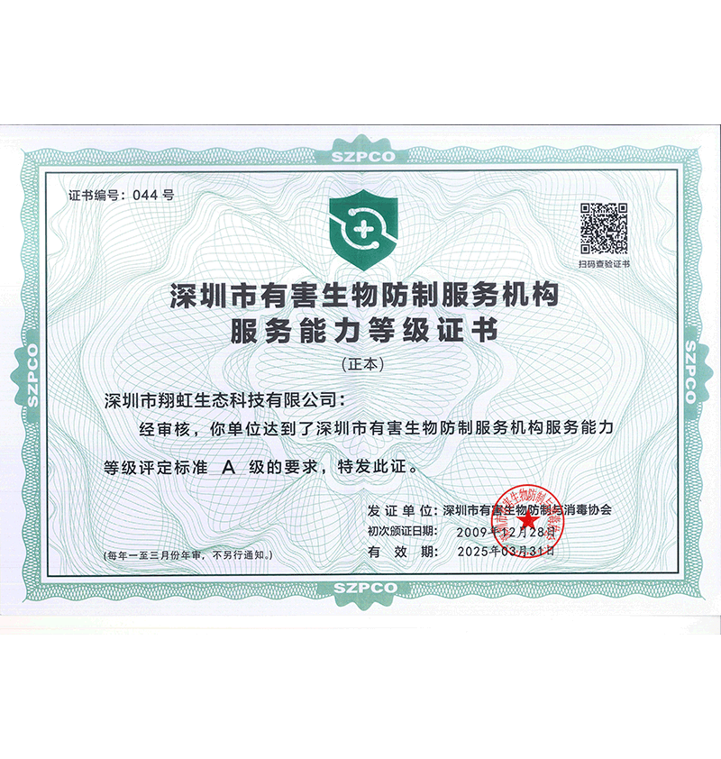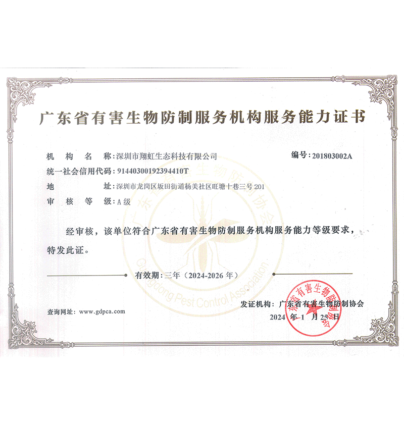 深圳市有害生物防制服務(wù)機(jī)構(gòu)服務(wù)能力等級(jí)證書(shū)