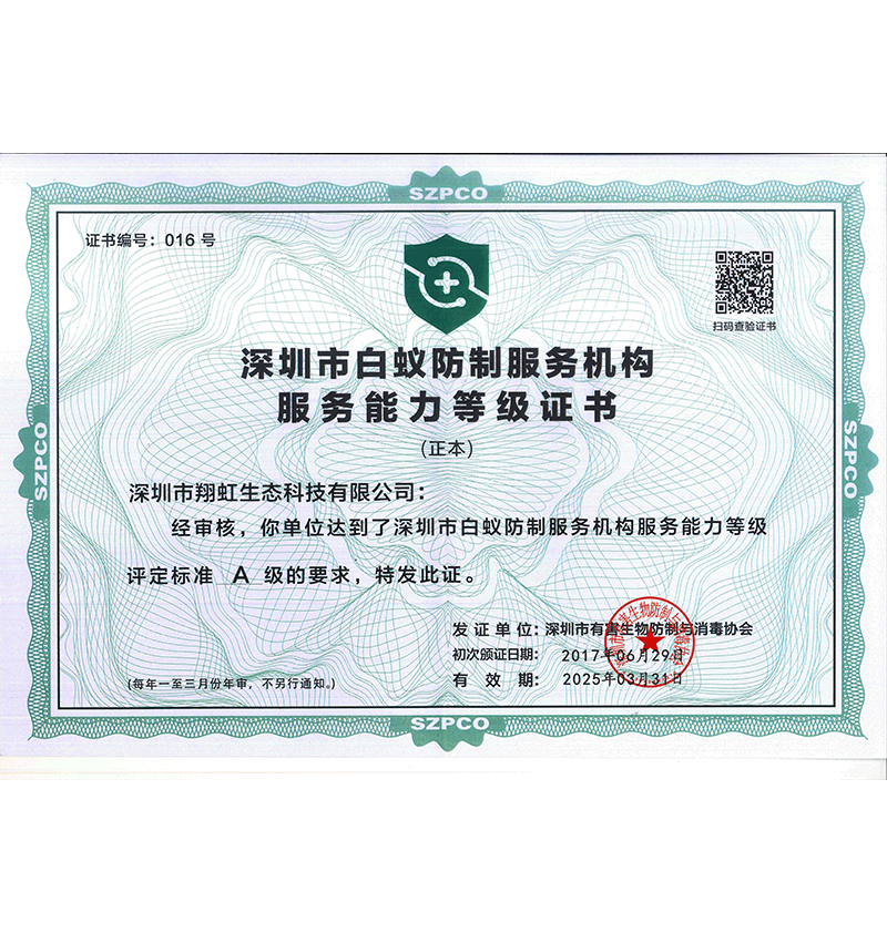 深圳市白蟻防制服務(wù)機(jī)構(gòu)服務(wù)能力等級(jí)證書(shū)